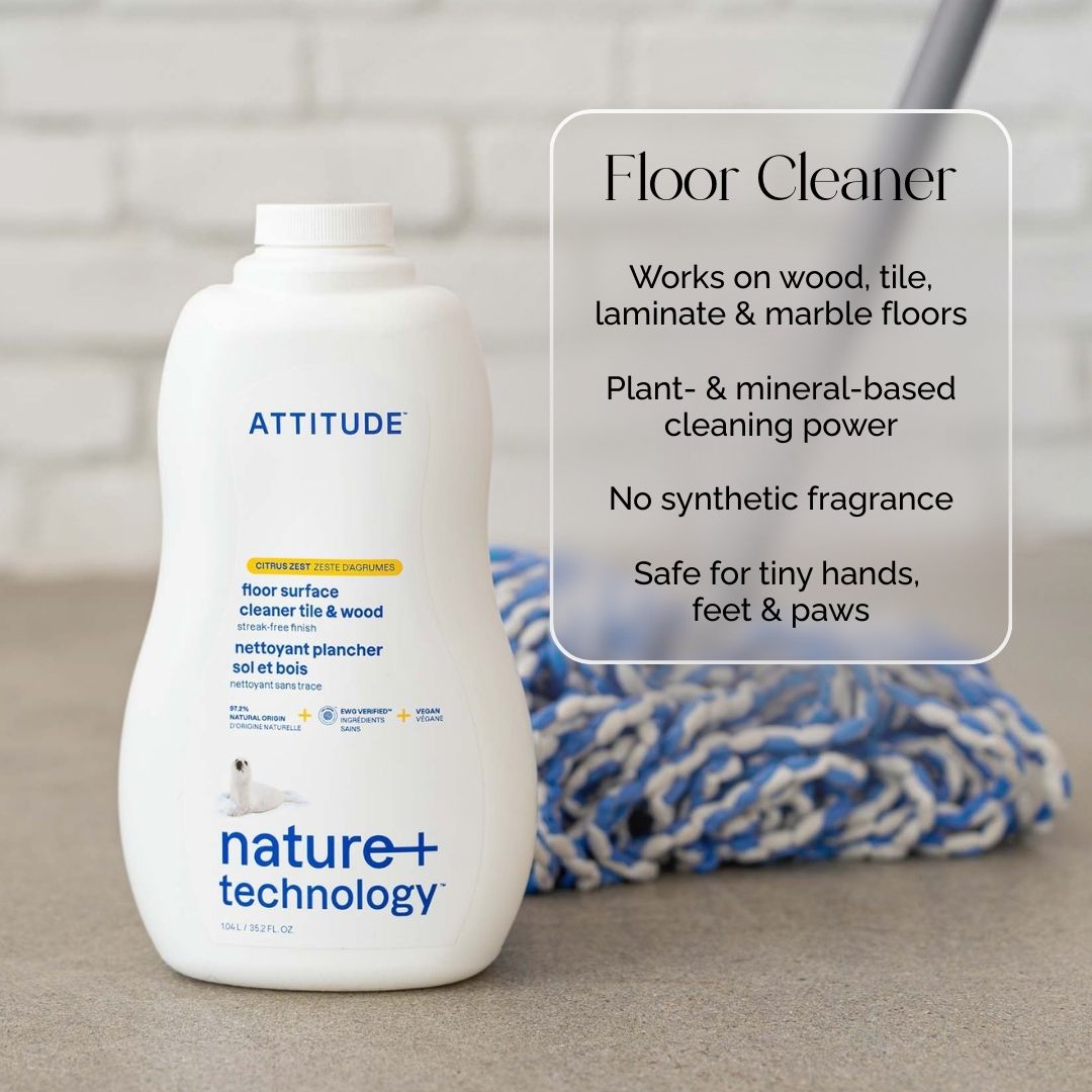 Infused with a crisp and refreshing aroma, ATTITUDE™ floor surface cleaner – tile & wood – Citrus zest dissolves stubborn dirt and grime to reveal the natural beauty of your floors. This floor surface cleaner is your new essential for maintaining your laminate, wooden, tile, ceramic and marble floors.