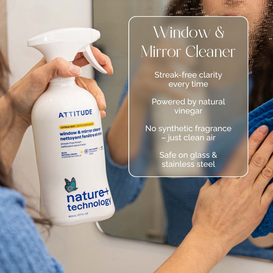 ATTITUDE™ window & mirror cleaner – citrus zest quickly eliminates grease and dirt from glass and mirrors. Its invigorating citrus top notes blend harmoniously with floral and herbaceous lavender